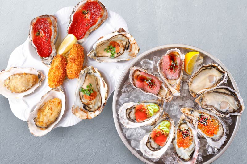 | ホットオイスターセット12ピース 《生牡蠣2個/イクラと白だしジュレのオイスターカクテル 2個/ スモークサーモンとアボカドワカモレのオイスターカクテル 2個/ ウニと牡蠣醤油の焼き牡蠣 2個/ トマトガーリックソースと香草の焼き牡蠣 2個/ カキフライ 2個》 |