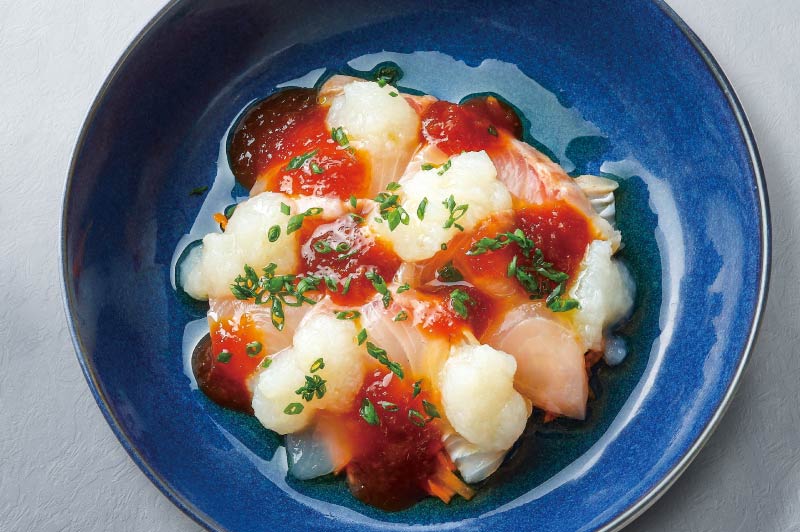 | 鮮魚のカルパッチョ 〜キャロットラペと柚子ソース〜 |